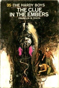 Cover: Rudy Nappi.   Hate it.  So dark.  Very symbolic by throwing together elements in the book that don’t belong in the same scene.  That shrunken head?  Appears in a benign setting at the very beginning of the book and then disappears.  Yet here it is front and center as if the Hardy Boys are going to face down headhunters.  Nope.  Don’t like this one, Mr. Nappi.